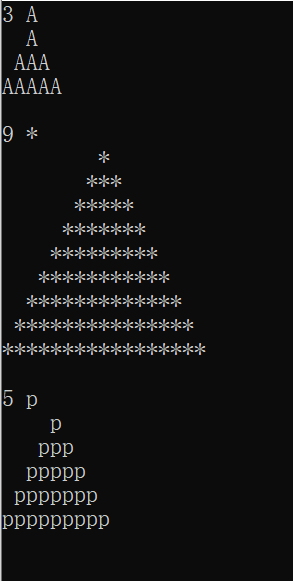 #include<stdio.h> void draw(int n,char symbol); #include<stdio.h> int main(){ int n,symbol; while(scanf("%d %c",&n,&symbol)!=EOF){ draw(n,symbol); printf("\n"); } return 0; } void draw(int n,char symbol){ int i,j; for(j=1;j<=n;j++){ for(i=1;i<=n-j;i++){ printf(" "); } for(i=1;i<=2*j-1;i++){ printf("%c",symbol); } printf("\n"); } }