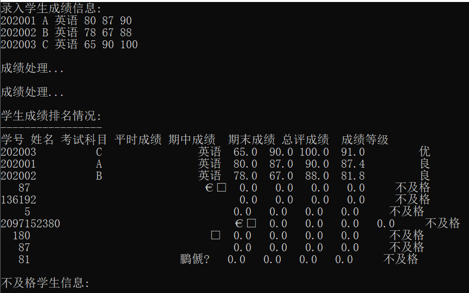 // P280例8.15 // 对教材上的程序作了微调整,把输出学生信息单独编写成一个函数模块 // 打印不及格学生信息和所有学生信息程分别调用 #include<stdio.h> #include<stdlib.h> #include<string.h> #define N 10 // 运行程序输入测试时,可以把N改小一些输入测试 typedef struct student { int id; /*学生学号 */ char name[20]; /*学生姓名 */ char subject[20]; /*考试科目 */ float perf; /*平时成绩 */ float mid; /* 期中成绩 */ float final; /* 期末成绩 */ float total; /* 总评成绩 */ char level[10]; /* 成绩等级 */ } STU; void input(STU[],int ); /*输入学生信息 */ void calc(STU[],int); /*计算总评和等级 */ int fail(STU[],STU [],int); /*不及格学生统计 */ void sort(STU[],int); /*排序 */ void print(STU[], int); /*输出学生信息*/ int main() { STU st[N],fst[N]; // 数组st记录学生信息,fst记录不及格学生信息 int k; // 用于记录不及格学生个数 printf("录入学生成绩信息:\n"); input(st,N); printf("\n成绩处理...\n"); calc(st,N); k = fail(st,fst,N); sort(st, N); printf("\n学生成绩排名情况:\n"); print(st, N); printf("\n不及格学生信息:\n"); print(fst, k); return 0; } // 输入学生信息 void input(STU s[],int n) { int i; for(i=0;i<n;i++) scanf("%d %s %s %f %f %f",&s[i].id,s[i].name,s[i].subject,&s[i].perf,&s[i].mid,&s[i].final); } // 计算总评和等级 void calc(STU s[],int n) { int i; for(i=0;i<n;i++) { s[i].total=s[i].perf*0.2+s[i].mid*0.2+s[i].final*0.6; if(s[i].total>=90) strcpy(s[i].level,"优"); // 注意:等级是字符型数组,要使用strcpy完成赋值 else if(s[i].total>=80 && s[i].total<90) strcpy(s[i].level,"良"); else if(s[i].total>=70 && s[i].total<80) strcpy(s[i].level,"中"); else if(s[i].total>=60 && s[i].total<70) strcpy(s[i].level,"及格"); else strcpy(s[i].level,"不及格"); } } // 不及格学生统计 // 数组s存放的是所有学生信息,数组t存放不及格学生信息,n是数组s中元素个数 // 函数返回值:返回的是不及格人数 int fail(STU s[],STU t[],int n) { int i,k=0; for(i=0;i<n;i++) if(s[i].total<60) t[k++]=s[i]; return k; } // 根据总评成绩对学生记录信息排序 // 使用的是冒泡排序算法 void sort(STU s[],int n) { int i,j; STU temp; for(i=0;i<n-1;i++) for(j=0;j<n-1-i;j++) if(s[j].total<s[j+1].total) { temp = s[j]; s[j] = s[j+1]; s[j+1] = temp; } } // 输出学生信息 void print(STU s[], int n) { int i; printf("-----------------\n"); printf("学号 姓名 考试科目 平时成绩 期中成绩 期末成绩 总评成绩 成绩等级\n"); for(i=0;i<n;i++) printf("%5d %10s%20s %5.1f %5.1f %5.1f %5.1f %10s\n",s[i].id,s[i].name,s[i].subject,s[i].perf,s[i].mid,s[i].final,s[i].total,s[i].level); }
