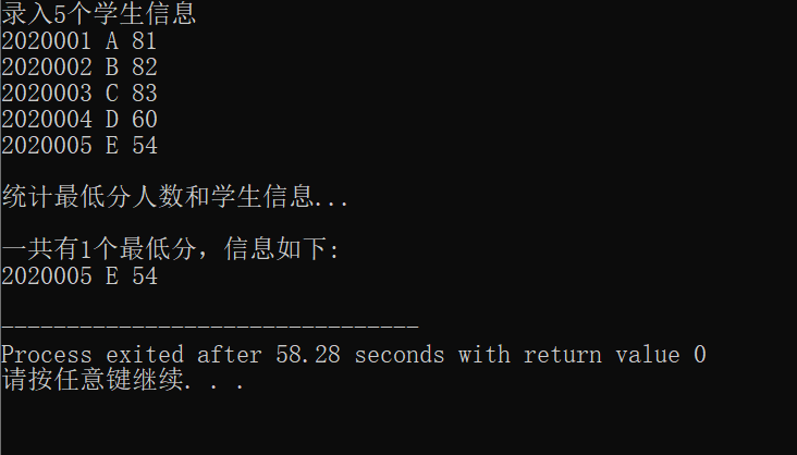 #include <stdio.h> const int N=5; // 定义结构体类型struct student,并定义STU为其别名 typedef struct student { long no; char name[20]; int score; }STU; // 函数声明 void input(STU s[], int n); int findMinlist(STU s[], STU t[], int n); void output(STU s[], int n); int main() { STU stu[N], minlist[N]; int count; printf("录入%d个学生信息\n", N); input(stu, N); printf("\n统计最低分人数和学生信息...\n"); count = findMinlist(stu, minlist, N); printf("\n一共有%d个最低分,信息如下:\n", count); output(minlist, count); return 0; } // 输入n个学生信息,存放在结构体数组s中 void input(STU s[], int n) { int i; for(i=0; i<n; i++) scanf("%ld %s %d", &s[i].no, s[i].name, &s[i].score); } // 输出结构体s中n个元素信息 void output(STU s[], int n) { int i; for(i=0; i<n; i++) printf("%ld %s %d\n", s[i].no, s[i].name, s[i].score); } // 在结构体数组s中,查找最低分学生的记录,将其存入结构体数组t中 // 形参n是结构体数组s中元素个数 // 函数返回最低分的学生人数 int findMinlist(STU s[], STU t[], int n) { // 补足函数实现 int i,j,k; i=s[0].score; for(j=0;j<n;j++){ if(i>s[j].score) i=s[j].score; } for(j=0;j<n;j++) if(i==s[j].score) t[k++]=s[j]; return k; }