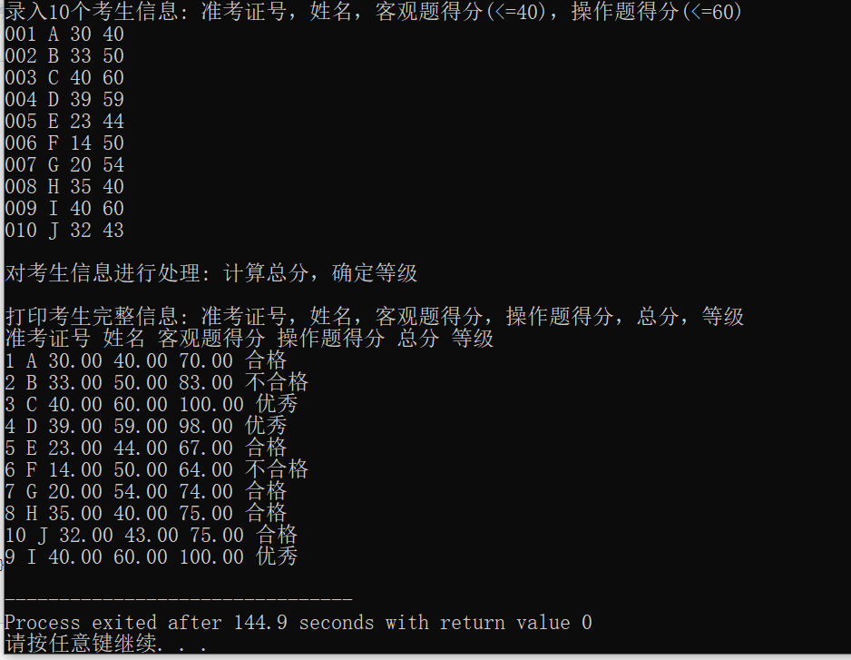 #include <stdio.h> #include <string.h> const int N = 10; // 定义结构体类型struct student,并定义其别名为STU typedef struct student { long int id; char name[20]; float objective; /*客观题得分*/ float subjective; /*操作题得分*/ float sum; char level[10]; }STU; // 函数声明 void input(STU s[], int n); void output(STU s[], int n); void process(STU s[], int n); int main() { STU stu[N]; printf("录入%d个考生信息: 准考证号,姓名,客观题得分(<=40),操作题得分(<=60)\n", N); input(stu, N); printf("\n对考生信息进行处理: 计算总分,确定等级\n"); process(stu, N); printf("\n打印考生完整信息: 准考证号,姓名,客观题得分,操作题得分,总分,等级\n"); output(stu, N); return 0; } // 录入考生信息:准考证号,姓名,客观题得分,操作题得分 void input(STU s[], int n) { // 补足代码 int i; for(i=0;i<n;i++) scanf("%ld %s %f %f",&s[i].id,s[i].name,&s[i].objective,&s[i].subjective); } //输出考生完整信息: 准考证号,姓名,客观题得分,操作题得分,总分,等级 void output(STU s[], int n) { // 补足代码 int i; printf("准考证号 姓名 客观题得分 操作题得分 总分 等级\n"); for(i=0;i<n;i++) printf("%ld %s %.2f %.2f %.2f %s\n",s[i].id,s[i].name,s[i].objective,s[i].subjective,s[i].sum,s[i].level); } // 对考生信息进行处理:计算总分,排序,确定等级 void process(STU s[], int n) { // 补足代码 int i,j,max; STU temp; for(i=0;i<n;i++) s[i].sum=s[i].objective+s[i].subjective; for(j=0;j<n-1;j++){ max=j; for(i=j;i<n;i++) if(s[i].sum>s[max].sum) max=i; } if(max!=j){ temp=s[max]; s[max]=s[j]; s[j]=temp; } for(i=0;i<n;i++) { if(s[i].sum>s[n/10].sum) strcpy(s[i].level,"优秀"); else if(s[i].sum>s[n/2].sum&&s[i].sum<s[n/10].sum) strcpy(s[i].level,"合格"); else strcpy(s[i].level,"不合格"); } }