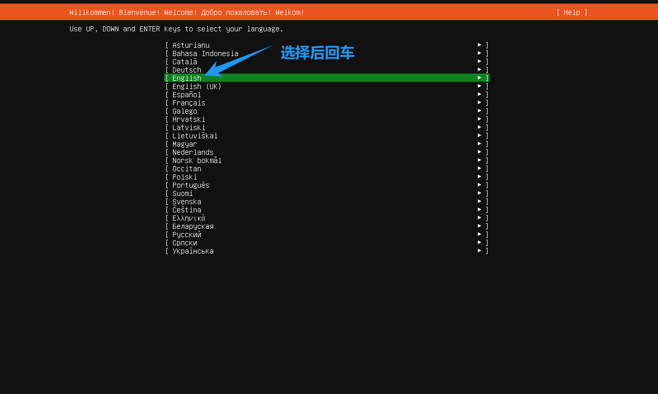 选择安装过程中使用的语言,建议选择 English (US) 作为默认键盘布局,后续可在系统内安装中文输入法。
