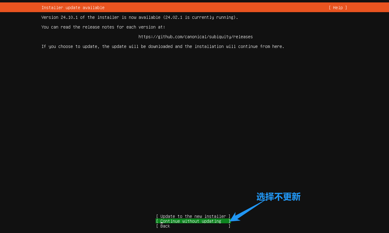 建议选择 “Continue without updating”,避免在线更新影响安装速度。