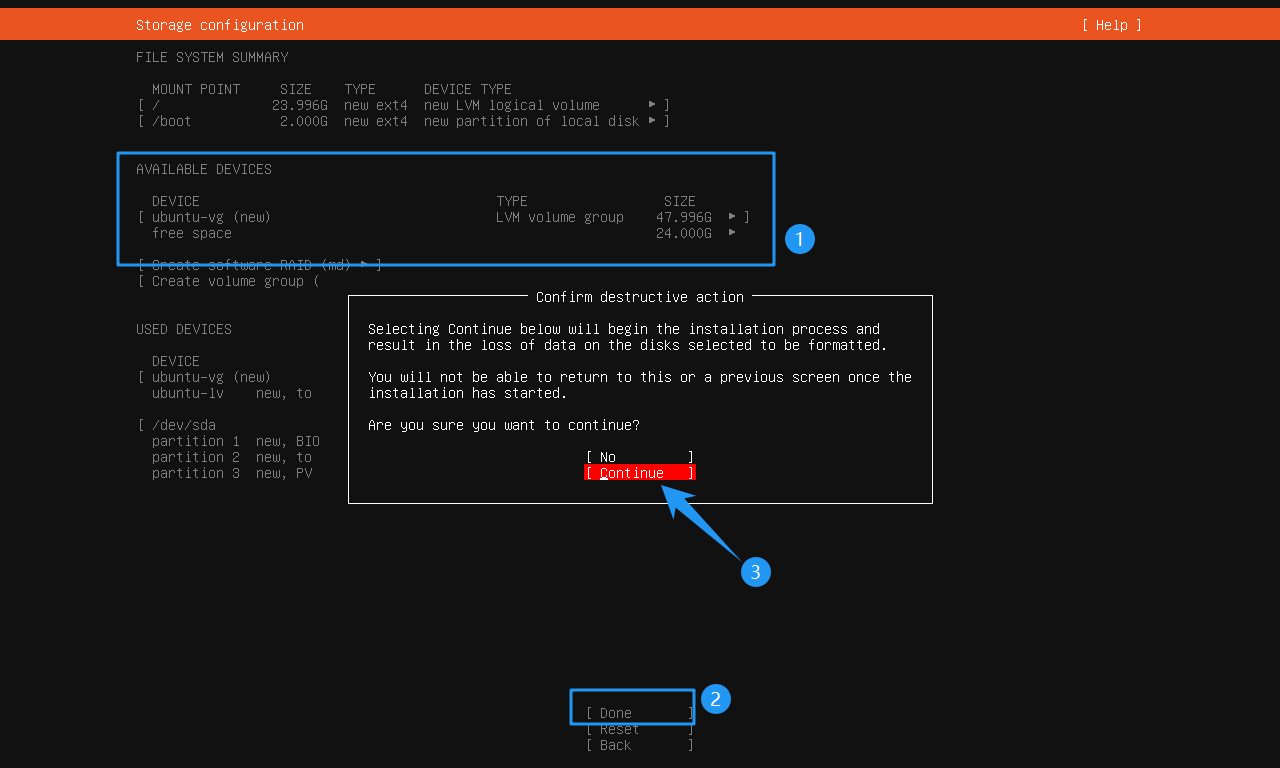 默认情况下,Ubuntu 会自动分配 /、swap 等分区,直接确认即可。