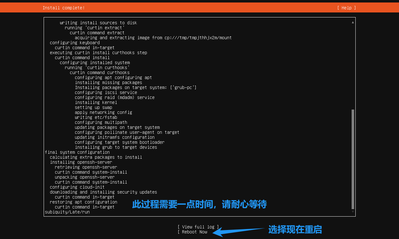 安装过程大约 10-20 分钟,完成后点击 “Reboot”。