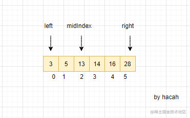 比较midIndex与我们要找的16,由于13小于16所以向左边寻找,就如下图。
