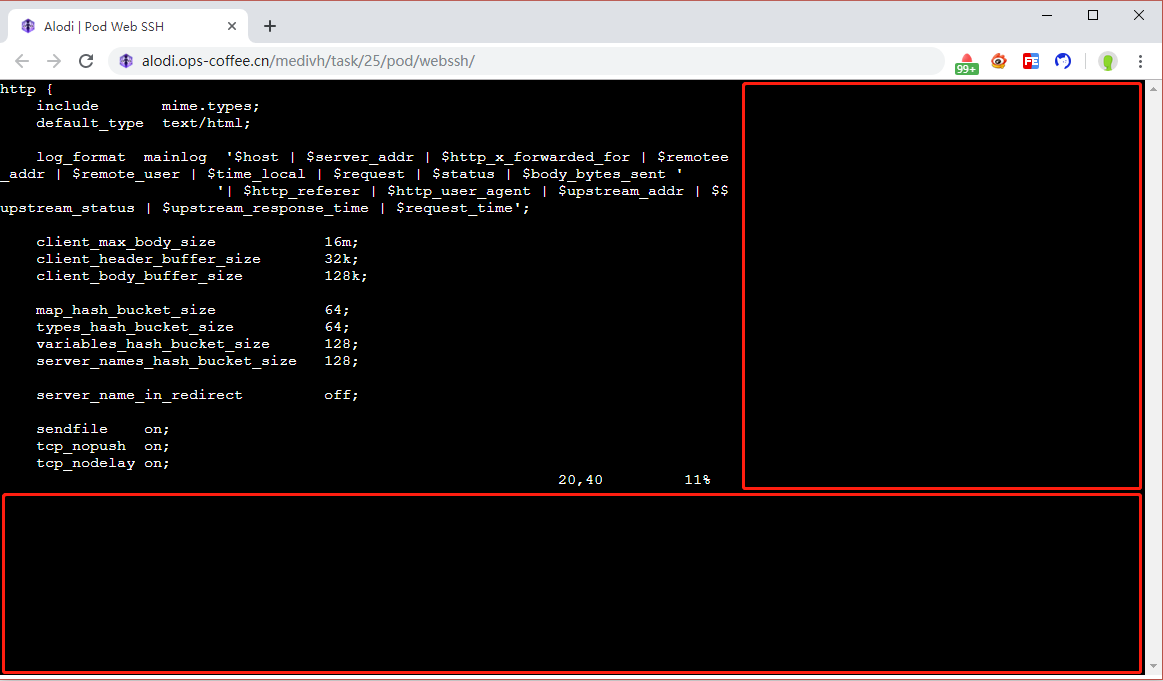 terminal内容窗口的大小没有办法调整,这会导致的一个问题就是浏览器上可显示内容的区域太小,当查看/编辑文件时非常不便,就像下边这样,红色可视区域并没有被用到。