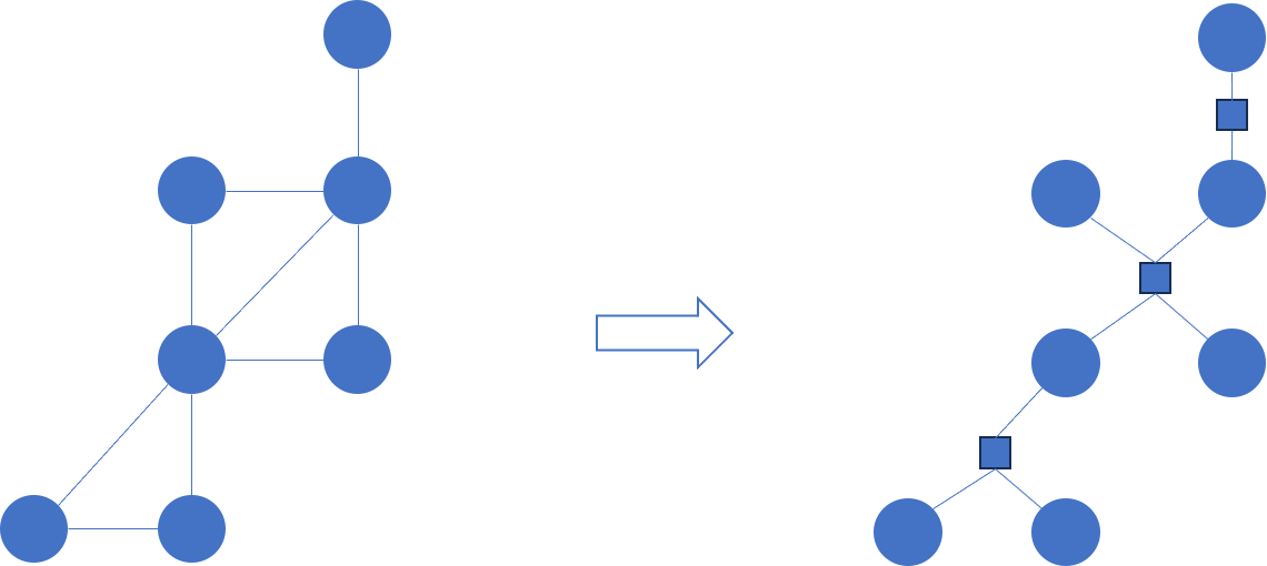 将原图中的点称为圆点,代表电双连通分量的点称为方点,那么这样的一棵树形结构被称为圆方树。圆方树的建立只需要在找到割点以及点双连通分量时,将当前点双连通分量代表的点编号记为cnt+n,再建立cnt+n到所有电双连通分量中点的边。