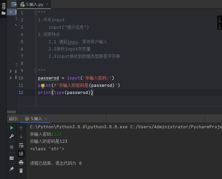 ✹ 当程序执行到input的时候,等待用户输入,输入完成后才继续往下执行 ✹ 在python中,input接收用户输入后,一般存储到变量,方便使用 ✹ 在python中,input会把接收到的任意用户输入的数据都当成字符串进行处理