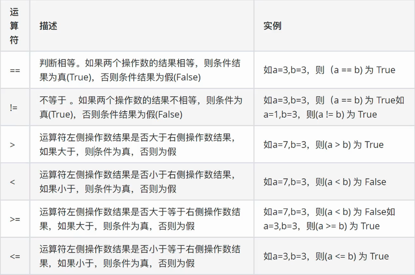 == ---> 判断是否相等 != --->不等于 > --->大于 < --->小于 >= --->大于等于 <= --->小于等于