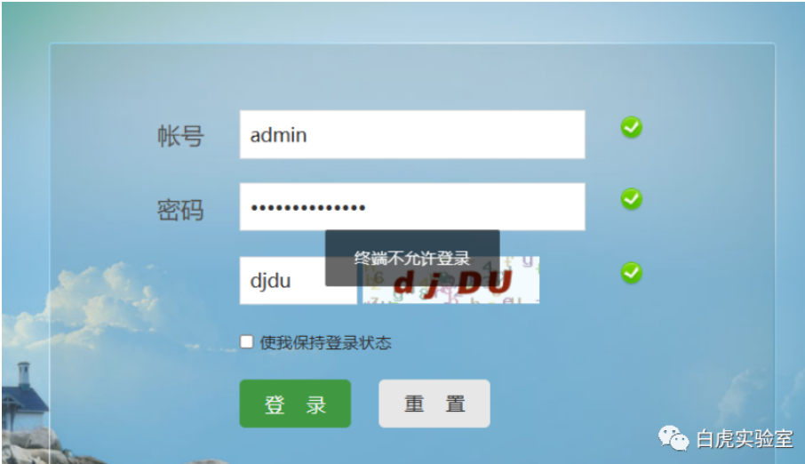 首先找到后台,后台直接url后跟admin直接跳转到登录框,尝试弱口令登录,提示终端不允许登录