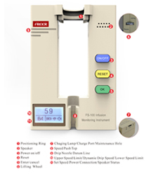 FS-100医用输液监视仪联网单机,具有将输液滴速信息和设备工作状态信息,通过无线方式外发的功能。同时也能接收监护管理系统相关工作指令。