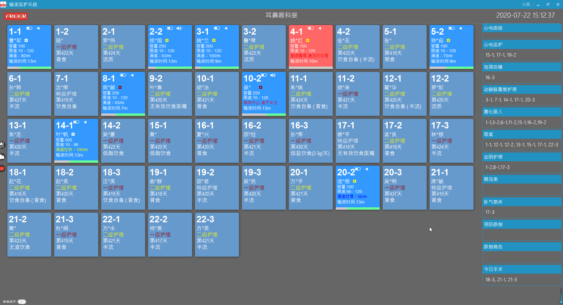 【选配模式】每科室选配8-15台仪器不等,各设备可在每个床位自由对应使用,对重点床位实施监护。选配版适各科室普及使用。尤其是夜间,值班护士和陪护人员少,患者本人嗜睡,输液滴速易于失察失控,应用本产品系统的实用价值很高。