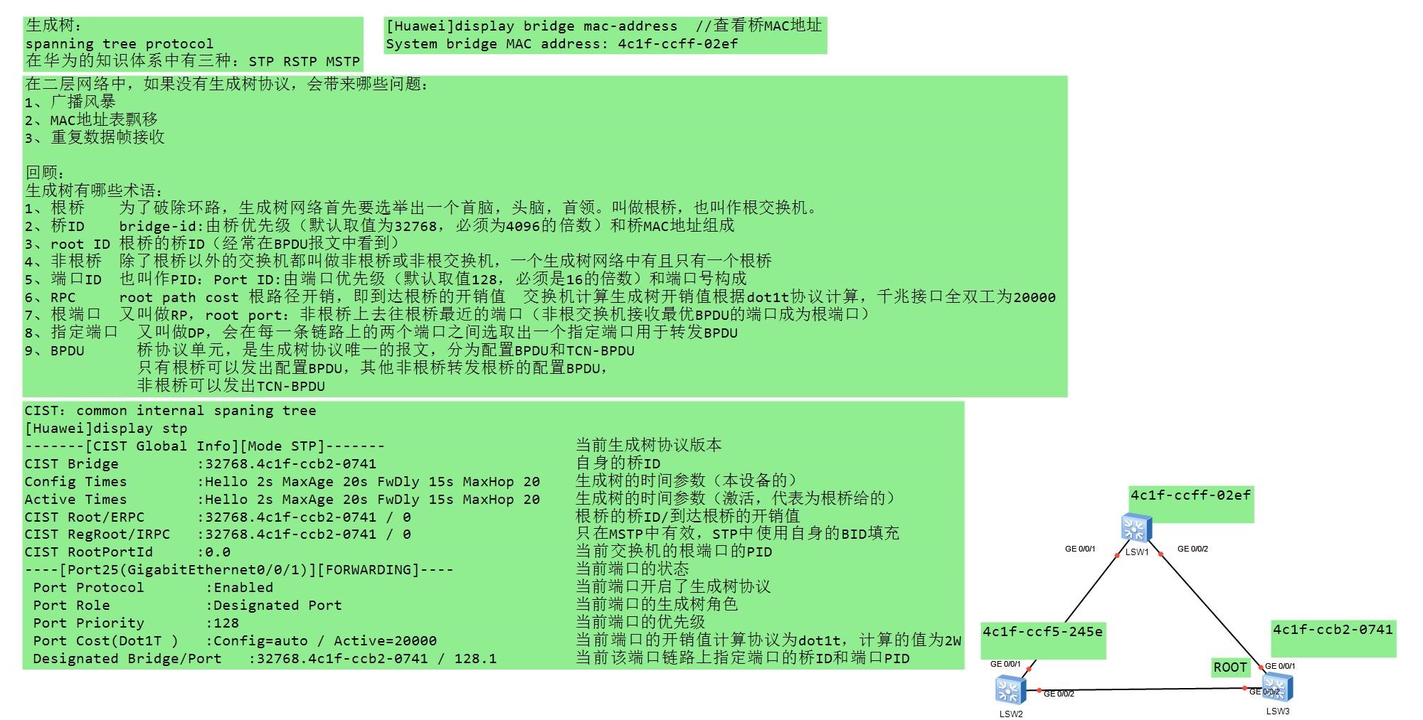 根桥:根桥是整体stp网络的中心 根桥优先级选举 默认为 32768和mac地址组成 查看根桥命令 display stp 查看mac地址 display bridge
