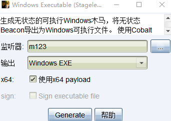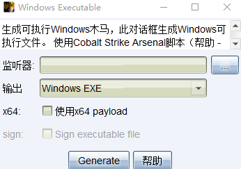和Windows Executable区别在于,它是直接导出一个beacon,这个beacon是直接写好的32或64位的dll,直接和监听器连接,传输数据和命令,它还可以导出powershell脚本,还可以通过raw选项调出.bin 文件,使用和Windows Executable差不多