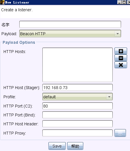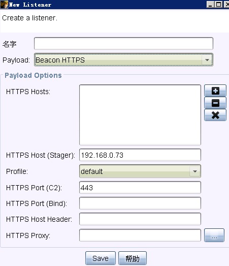 http hosts 和 http host(stager) 都填写攻击机的ip或C2域名,http port处填写端口,bind处的端口用于绑定web服务端口,一般用于重定向,host header用于域前置技术,用于隐藏C2,proxy 用于代理设置