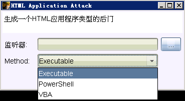 一个html应用程序类型的后门,有三种文件生成方式,分别为VBA,Powershell,Executable这三种方式