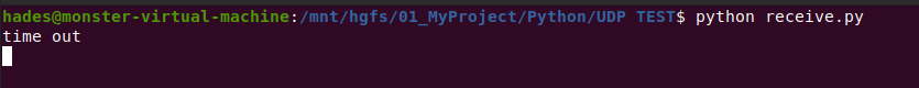 # -*- coding: utf-8 -*- import socket #导入socket模块 import time #导入time模块 #server 接收端 # 设置服务器默认端口号 PORT = 8000 #设置本地IP地址 LOCAL_IP="192.168.134.233" # 创建一个套接字socket对象,用于进行通讯 # socket.AF_INET 指明使用INET地址集,进行网间通讯 # socket.SOCK_DGRAM 指明使用数据协议,即使用传输层的udp协议 server_socket = socket.socket(socket.AF_INET, socket.SOCK_DGRAM) address = (LOCAL_IP, PORT) server_socket.bind(address) # 为服务器绑定一个固定的地址,ip和端口 server_socket.settimeout(10) #设置一个时间提示,如果10秒钟没接到数据进行提示 while True: #正常情况下接收数据并且显示,如果10秒钟没有接收数据进行提示(打印 "time out") #当然可以不要这个提示,那样的话把"try:" 以及 "except"后的语句删掉就可以了 try: now = time.time() #获取当前时间 # 接收客户端传来的数据 recvfrom接收客户端的数据,默认是阻塞的,直到有客户端传来数据 # recvfrom 参数的意义,表示最大能接收多少数据,单位是字节 # recvfrom返回值说明 # receive_data表示接受到的传来的数据,是bytes类型 # client 表示传来数据的客户端的身份信息,客户端的ip和端口,元组 receive_data, client = server_socket.recvfrom(1024) print(time.strftime('%Y-%m-%d %H:%M:%S',time.localtime(now))) #以指定格式显示时间 print("来自客户端%s,发送的%s\n" % (client, receive_data.decode())) #打印接收的内容 except socket.timeout: #如果10秒钟没有接收数据进行提示(打印 "time out") print("time out")