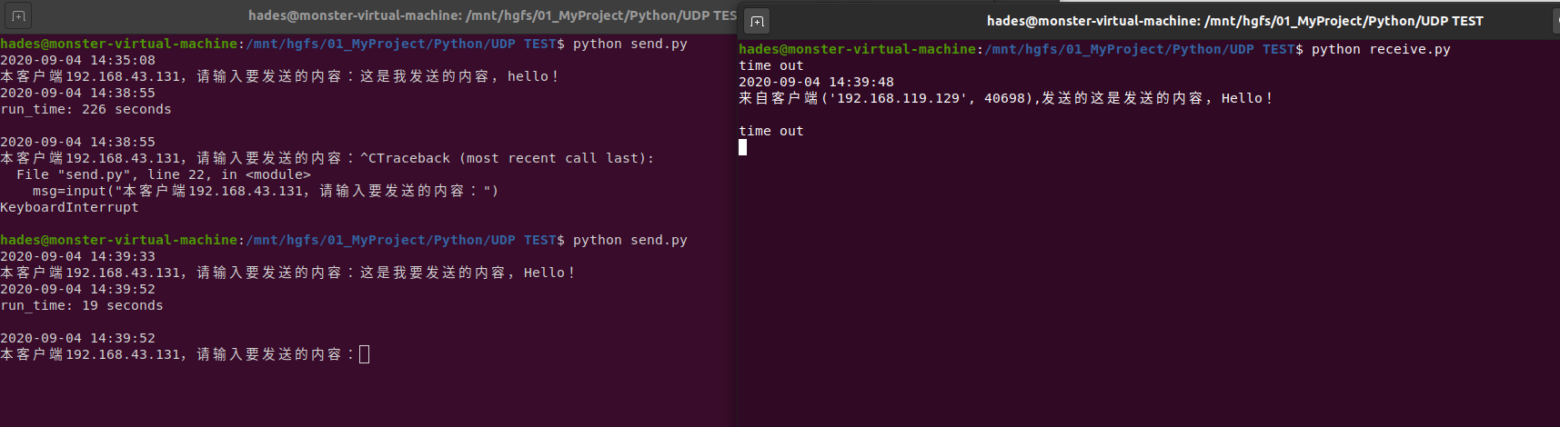 # -*- coding: utf-8 -*- import socket import time #client 发送端 client_socket = socket.socket(socket.AF_INET, socket.SOCK_DGRAM) PORT = 8000 RECEIVER_IP="192.168.134.233" while True: start = time.time() #获取当前时间 print(time.strftime('%Y-%m-%d %H:%M:%S',time.localtime(start))) #以指定格式显示当前时间 msg=input("本客户端192.168.43.131,请输入要发送的内容:") server_address = (RECEIVER_IP, PORT) # 接收方 服务器的ip地址和端口号 client_socket.sendto(msg.encode(), server_address) #将msg内容发送给指定接收方 now = time.time() #获取当前时间 run_time = now-start #计算时间差,即运行时间 print(time.strftime('%Y-%m-%d %H:%M:%S',time.localtime(now))) print("run_time: %d seconds\n" %run_time)