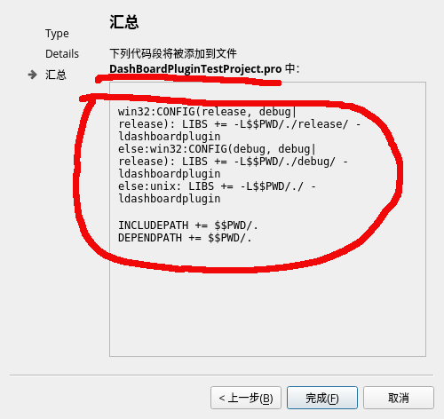 6. 此时QT会在我们的工程的.pro文件中自动添加库文件包含路径以及相应的配置,点击完成