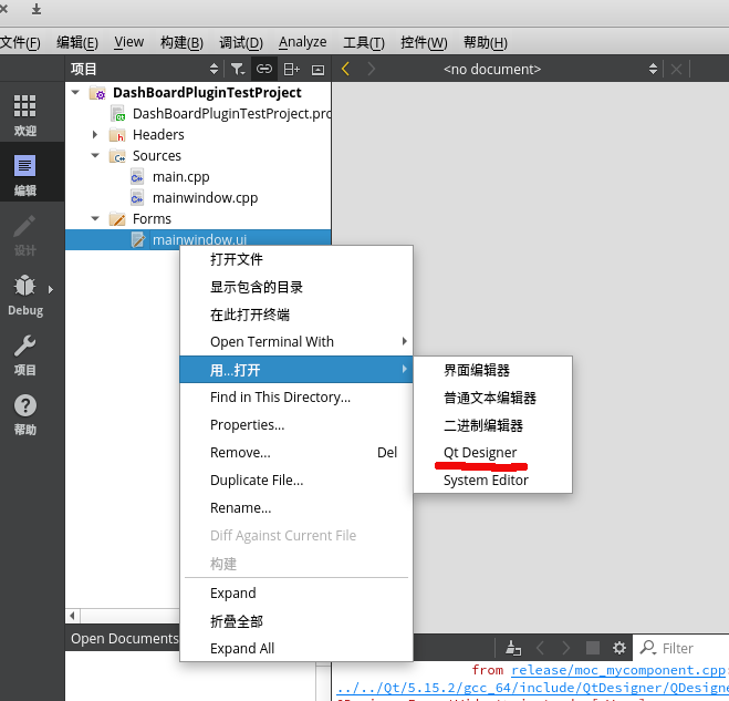 7. 此时我们已经可以使用该自定义控件库了,用QT designer打开该工程的.ui文件,