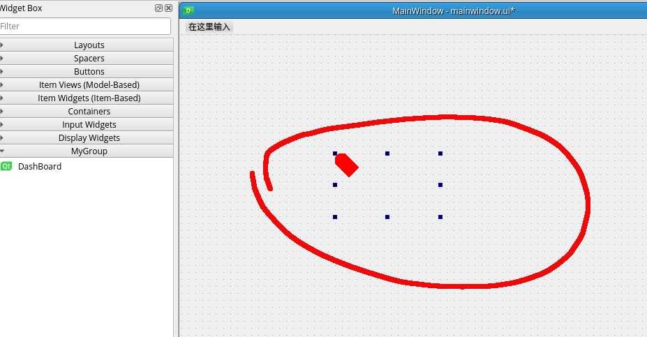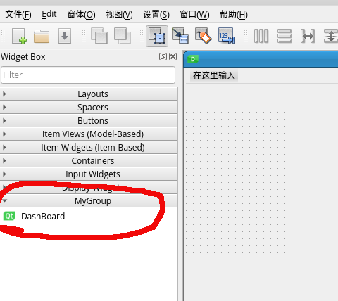8. 在QT Designer中我们看到在控件库多了一个我们的自定义控件dashboard,并且如果我们在创建时添加了组名的话,会自动添加进该分组