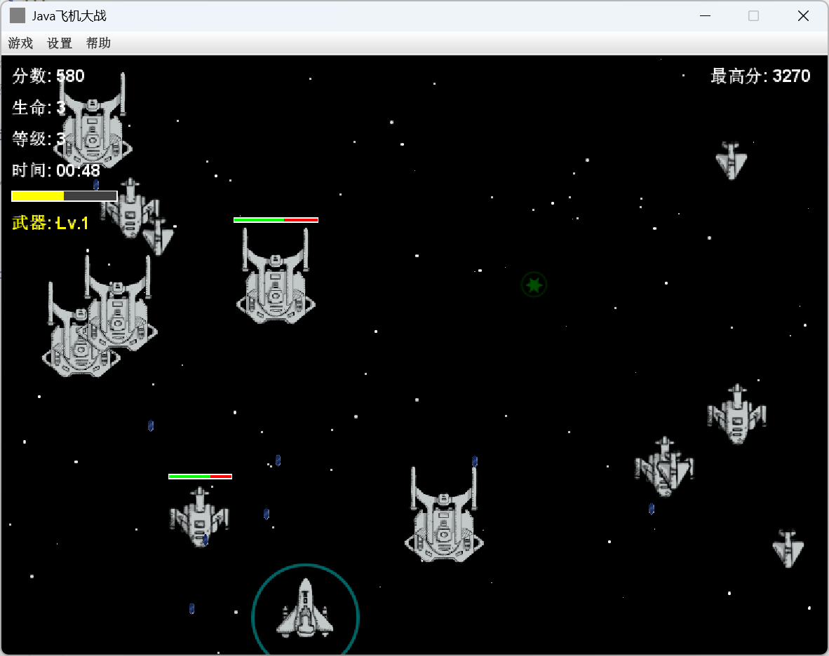 - 中型敌机:血量3,中等速度,分数30,可射击