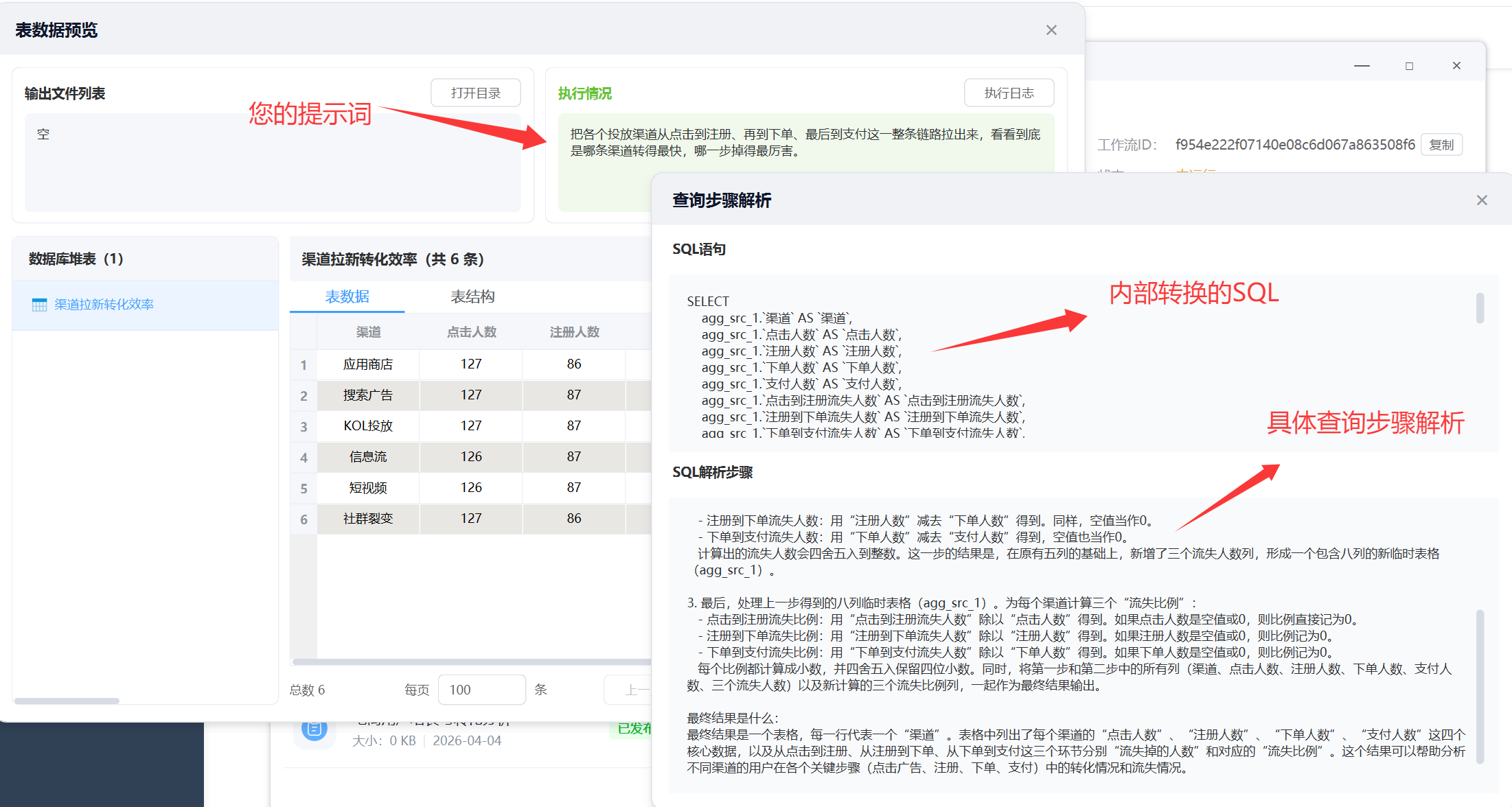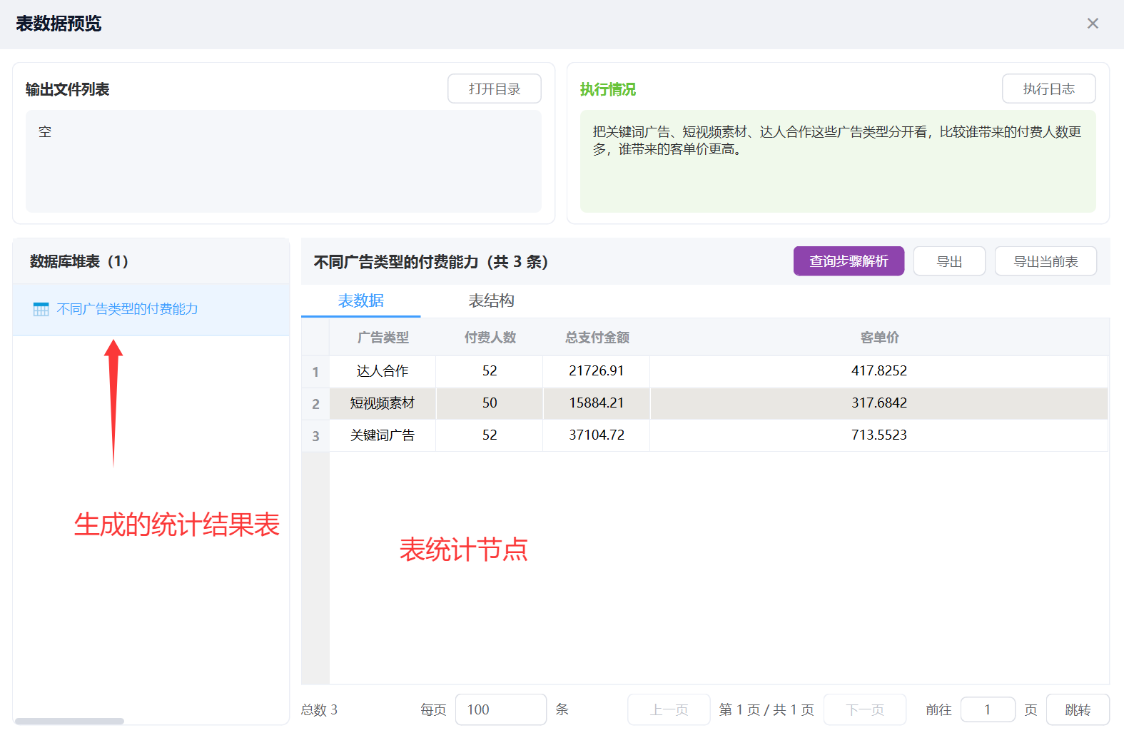 对于表统计,我们还可以回溯您的提示词,经过AI分析的具体步骤,如下案例: