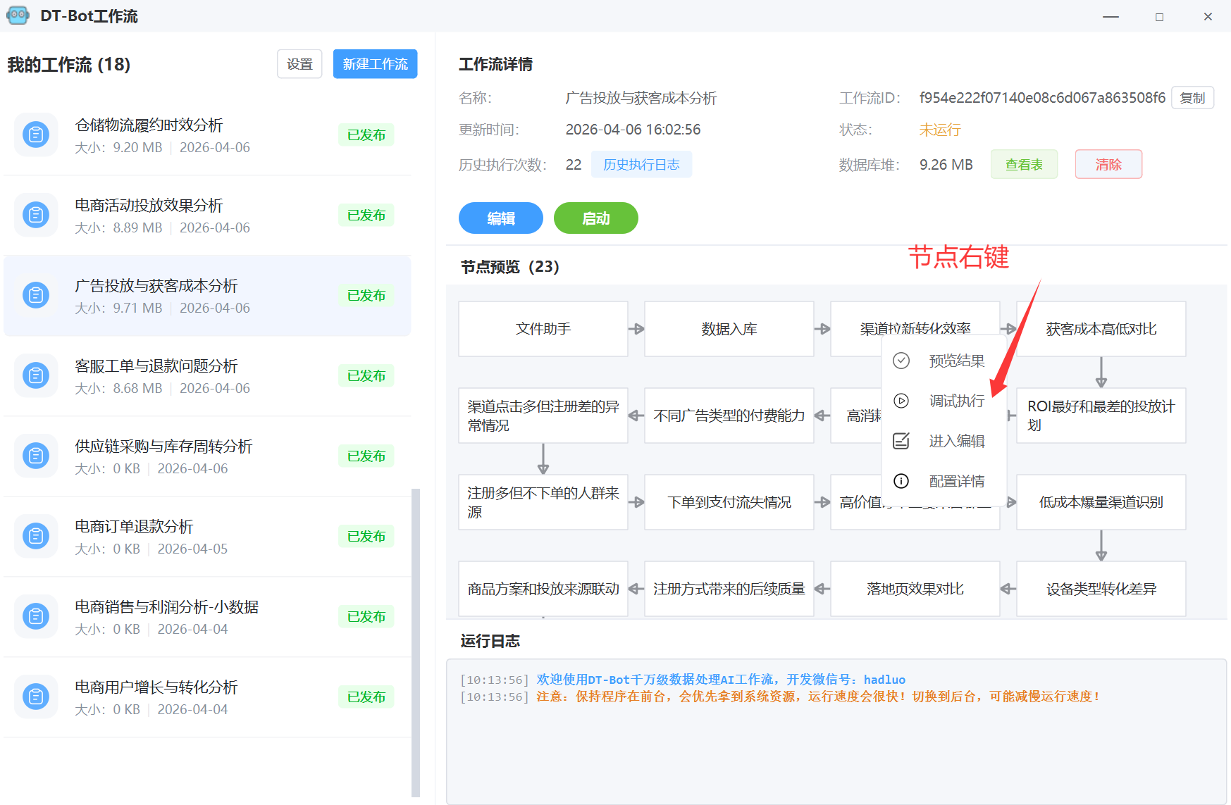 支持节点调试功能,您可以在任何一个节点进行运行,而不必每次都整个工作流执行,在节点右键即可执行调试。如图: