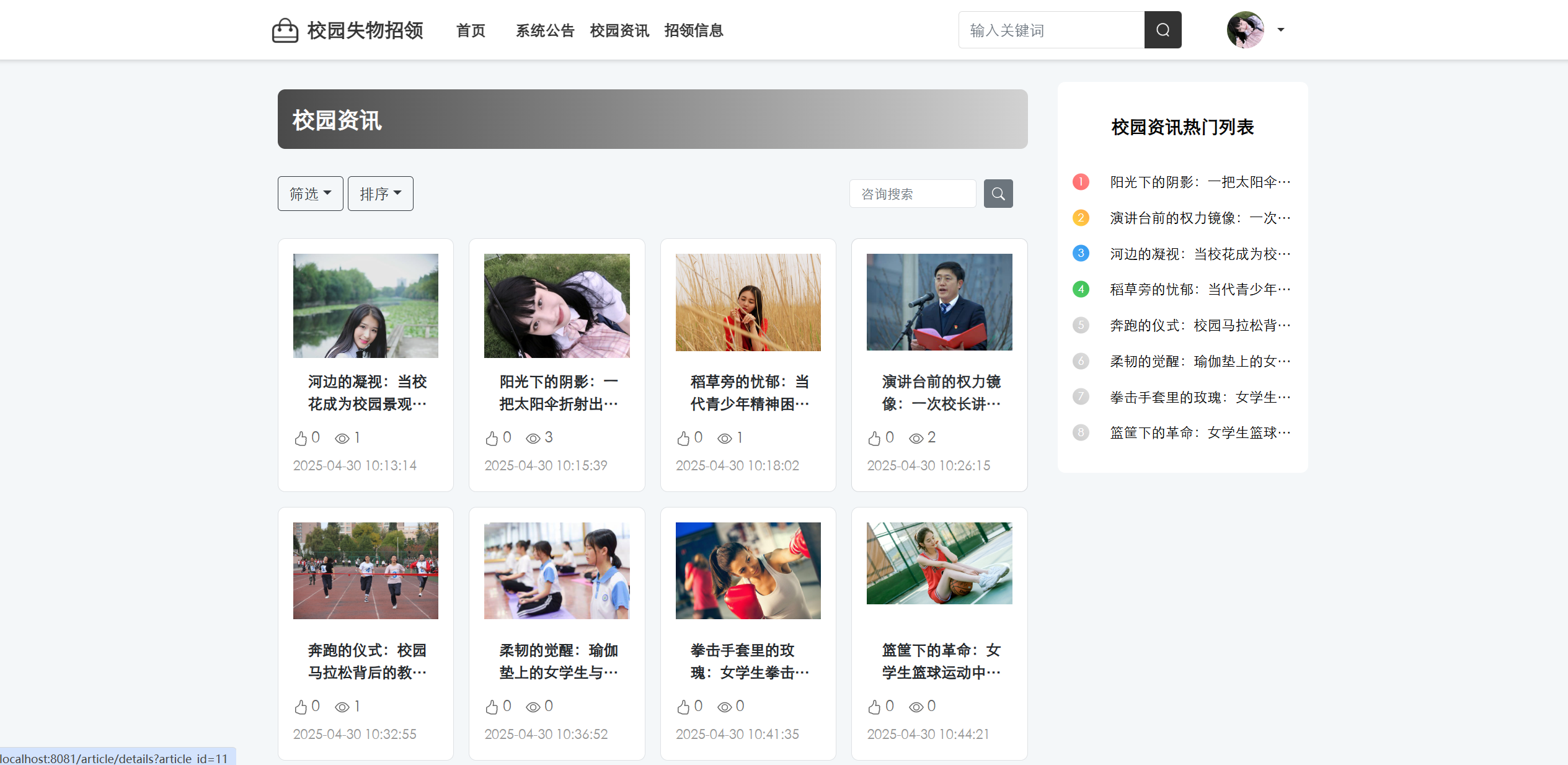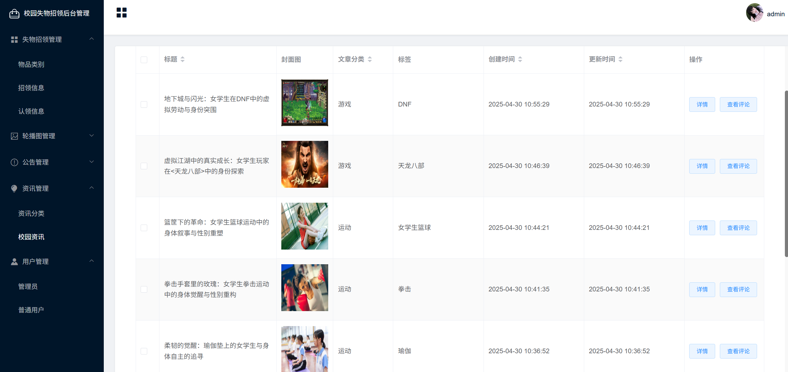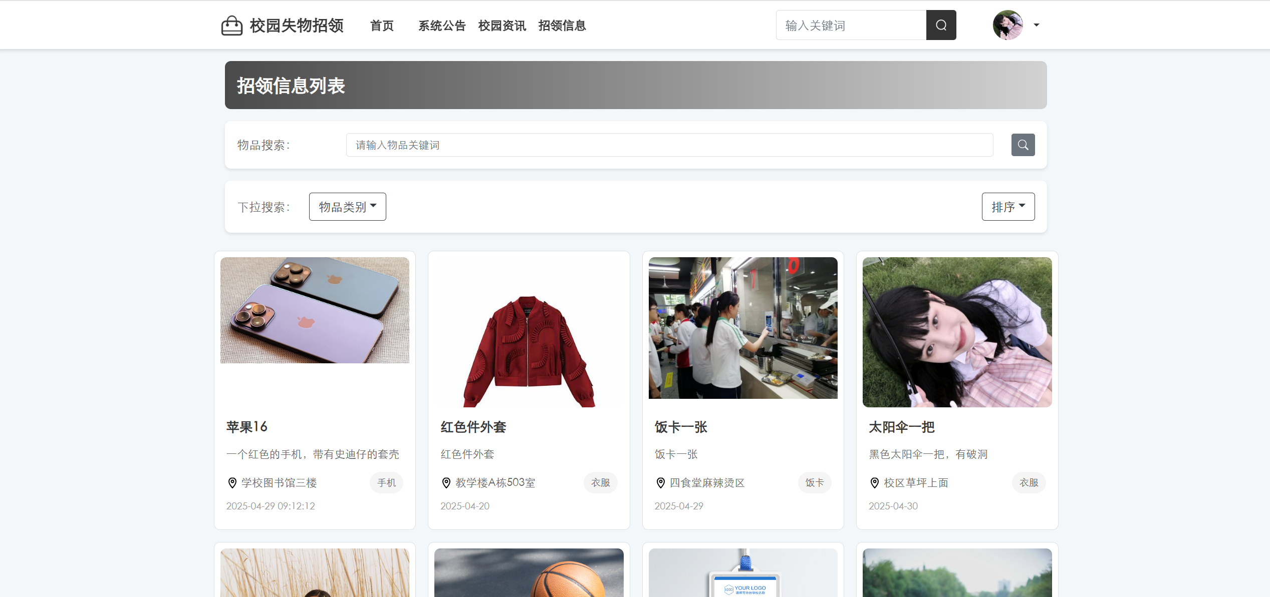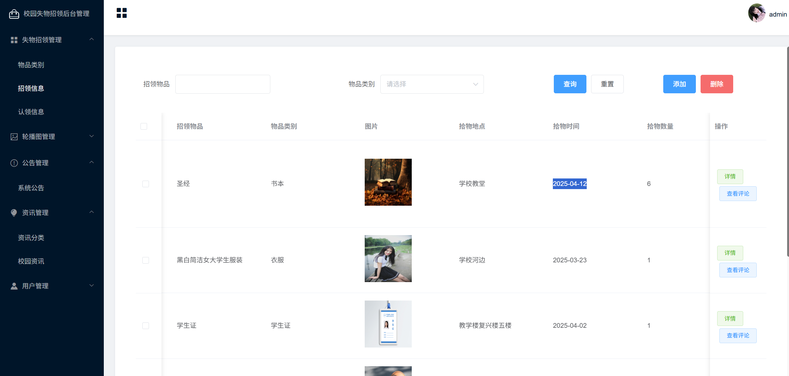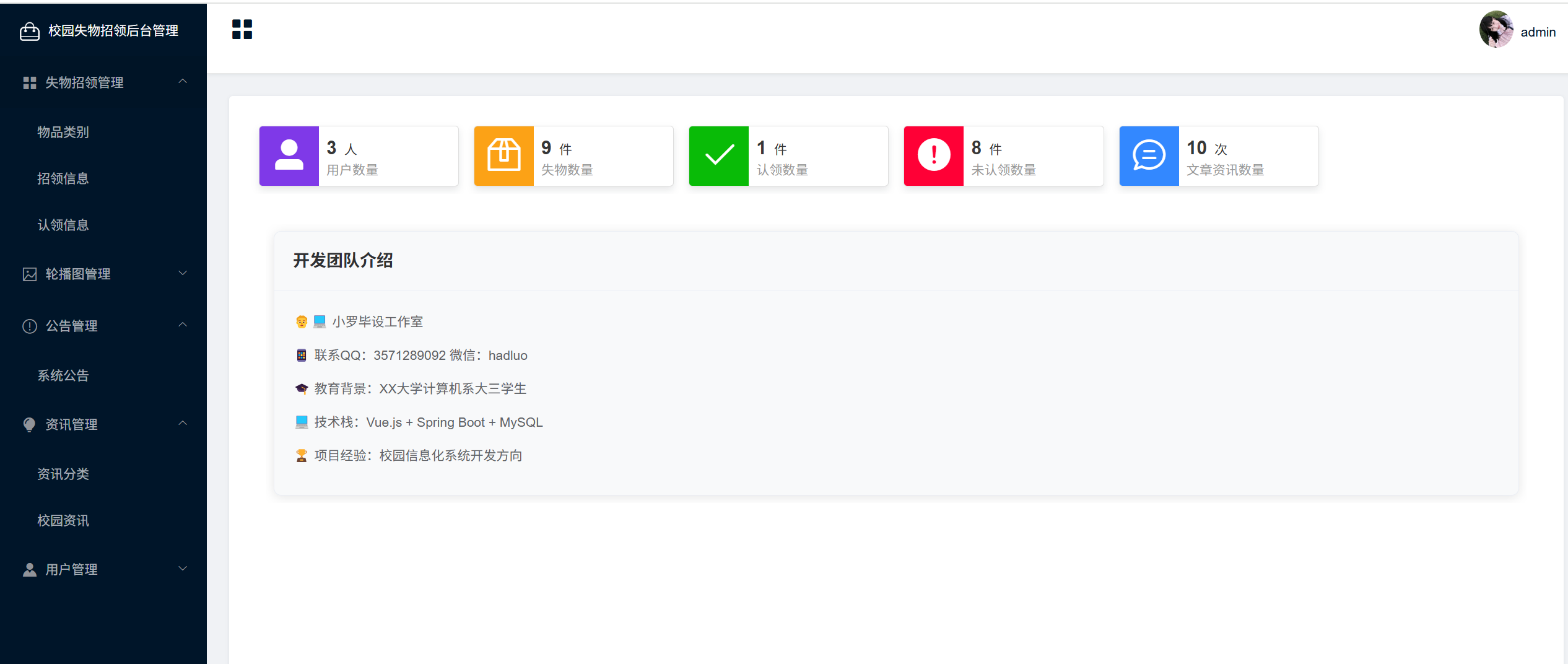 这是一个基于 Spring Boot + Vue.js 开发的校园失物招领平台系统,旨在为校园用户提供一个便捷的平台,用来找寻和发布丢失的物品。支持物品的自定义分类,用户认领物品等基础功能。还扩展了校园资讯,新闻信息等,用户可以自由留言等,还有着一套完善的用户权限体系,支持普通用户和管理员。