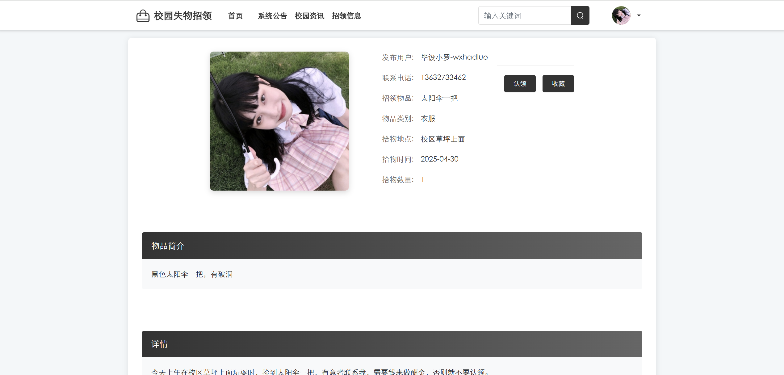 - 物品详情支持收藏和评论,还可以支持当前用户发起认领物品。