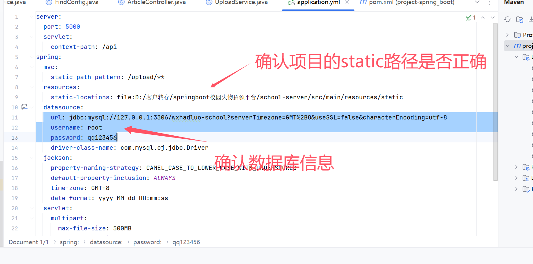 打开resources目录, 修改 application.yml 配置文件,主要修改下面几个信息: