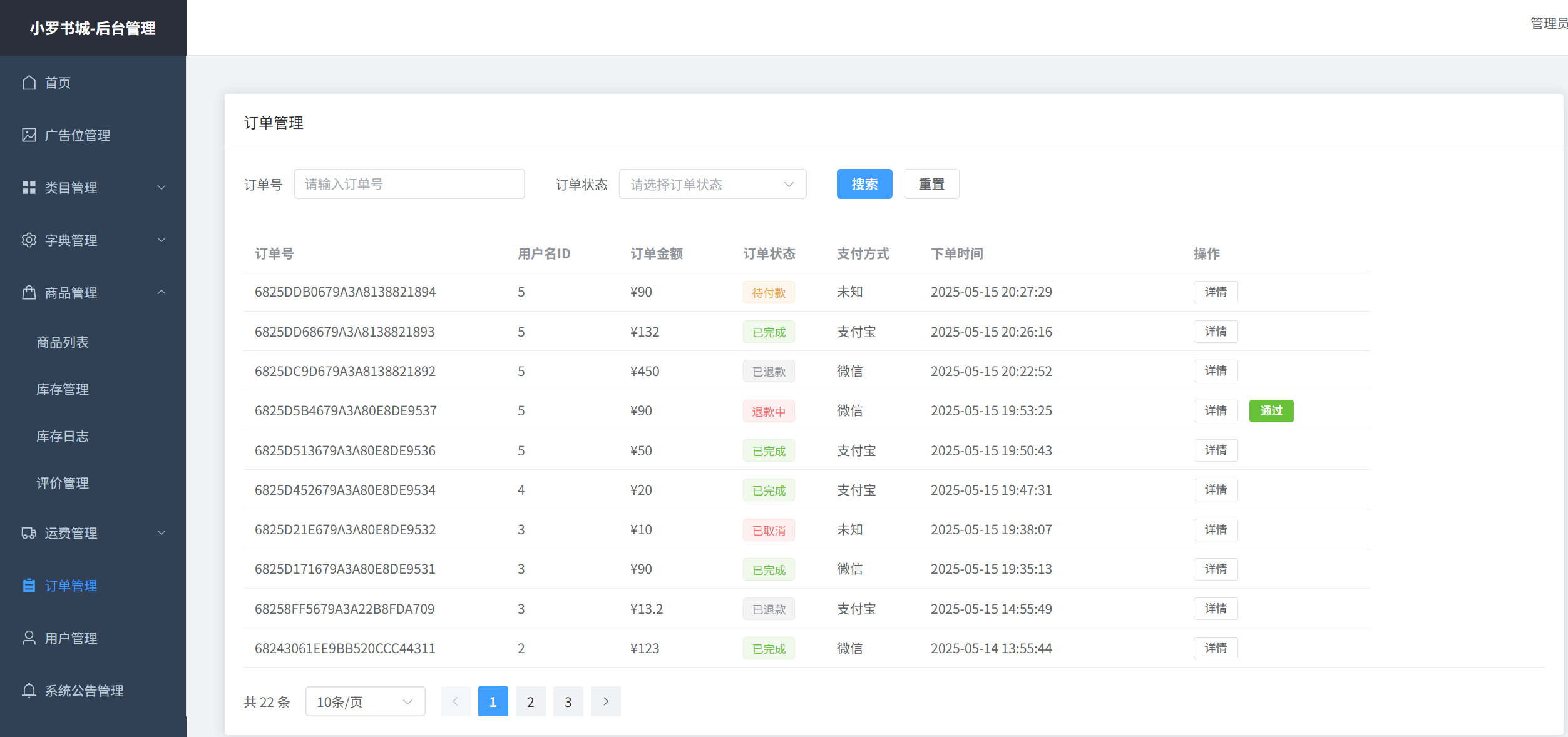 我们将订单的状态设计成以下几种:0-待付款 1-待发货 2-待收货 3-待评价 4-已完成 5-退款中 6-已退款 7-已取消。
