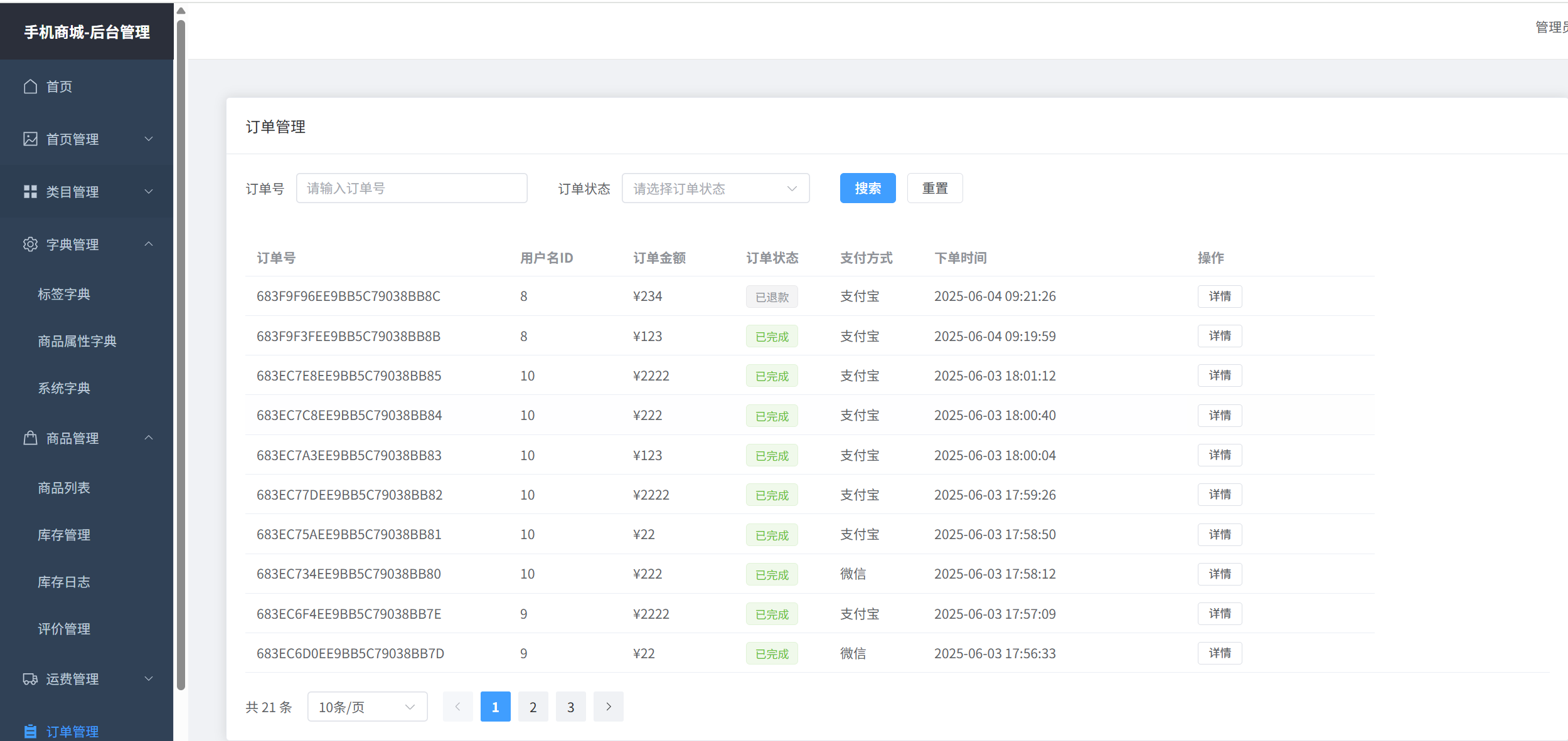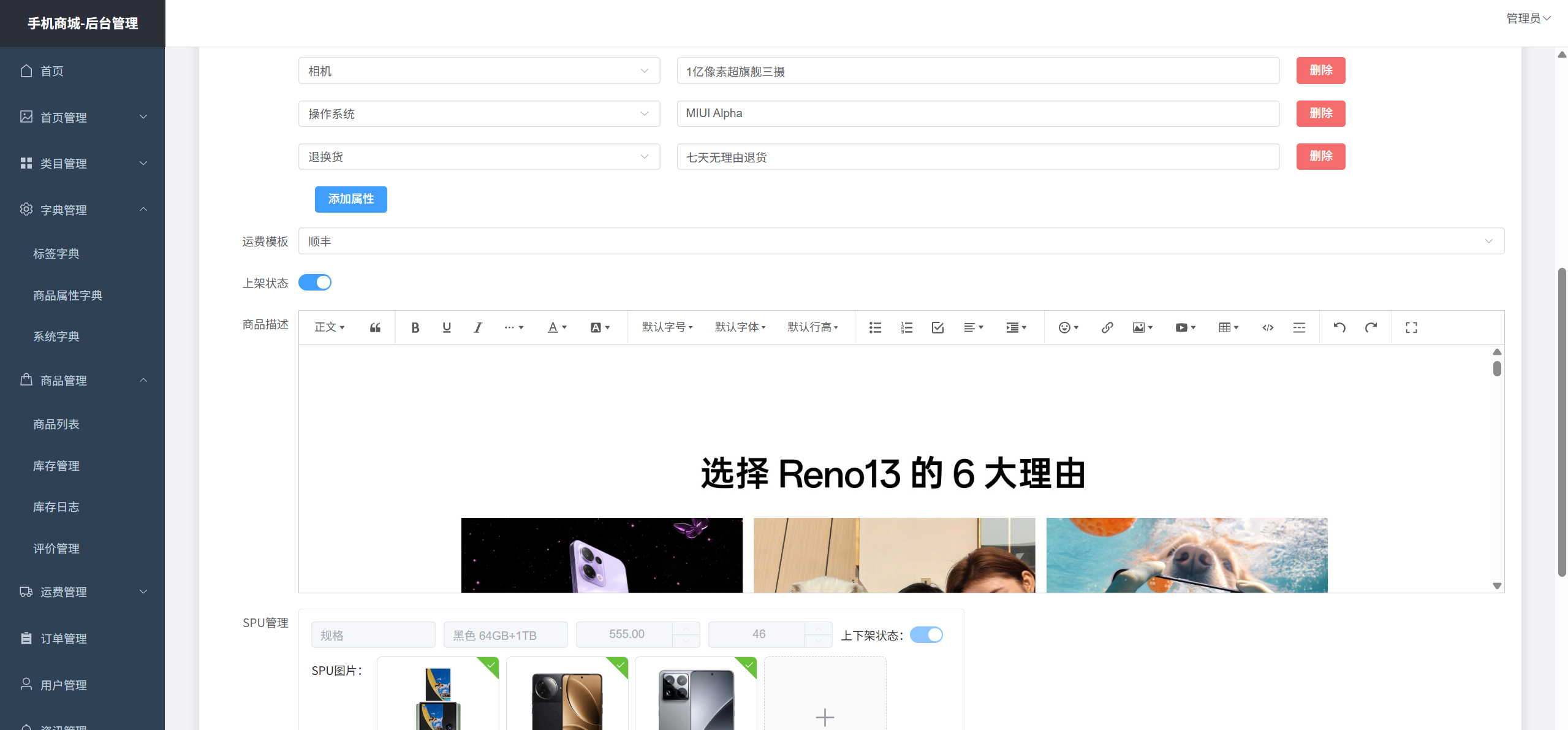 这个是系统的核心, 商品的很多属性,主要有: 手机的售卖标题,所属的分类,商品详情的动态属性,商品详情,spu等。在后台管理的商品管理里面可以对商品进行上下架,商品新增,修改,切不可删除。因为商品关联了很多表,如果不卖该商品了,只能作下架处理。