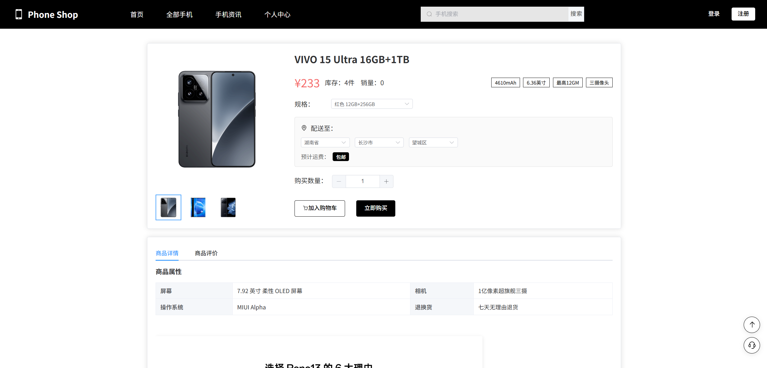 用户浏览手机商品时, 可以对手机进行收藏,添加购物车处理,收藏后可以在后台管理的用户列表的操作列看到查看收藏。前端用户自己也可以进行收藏取消等。