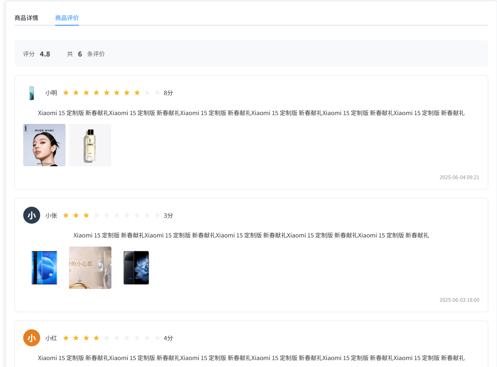 评价是商城不可或缺的一部分,很多用户就是看评价下单的,我们的评价有内容,还支持多张图片,还有评分等级。可以说是一个很丰富的评价体系 。这个评分还参与了用户协同过滤推荐系统。用户只有当订单处与完成状态时,才可以对商品进行评价。