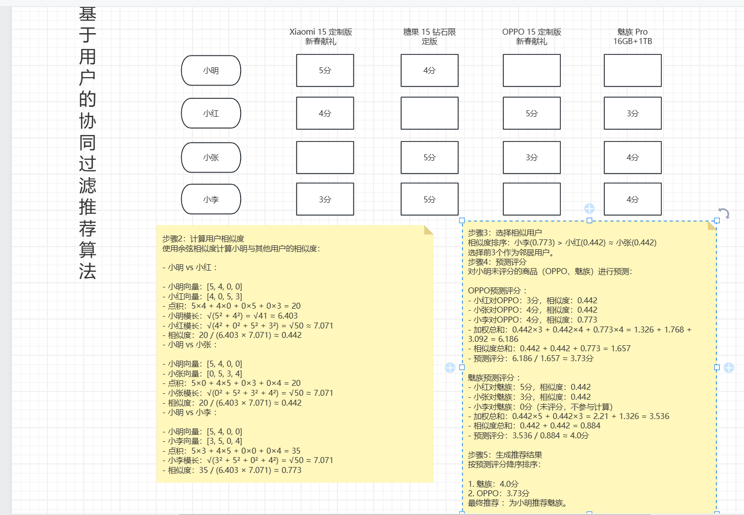 最后是计算加权平均,当中还需要进行 归一化处理, 来避免了因用户群体整体相似度偏高/偏低导致的预测偏差,使得推荐结果更贴近用户的真实偏好。 整体代码较长,我就不贴了。
