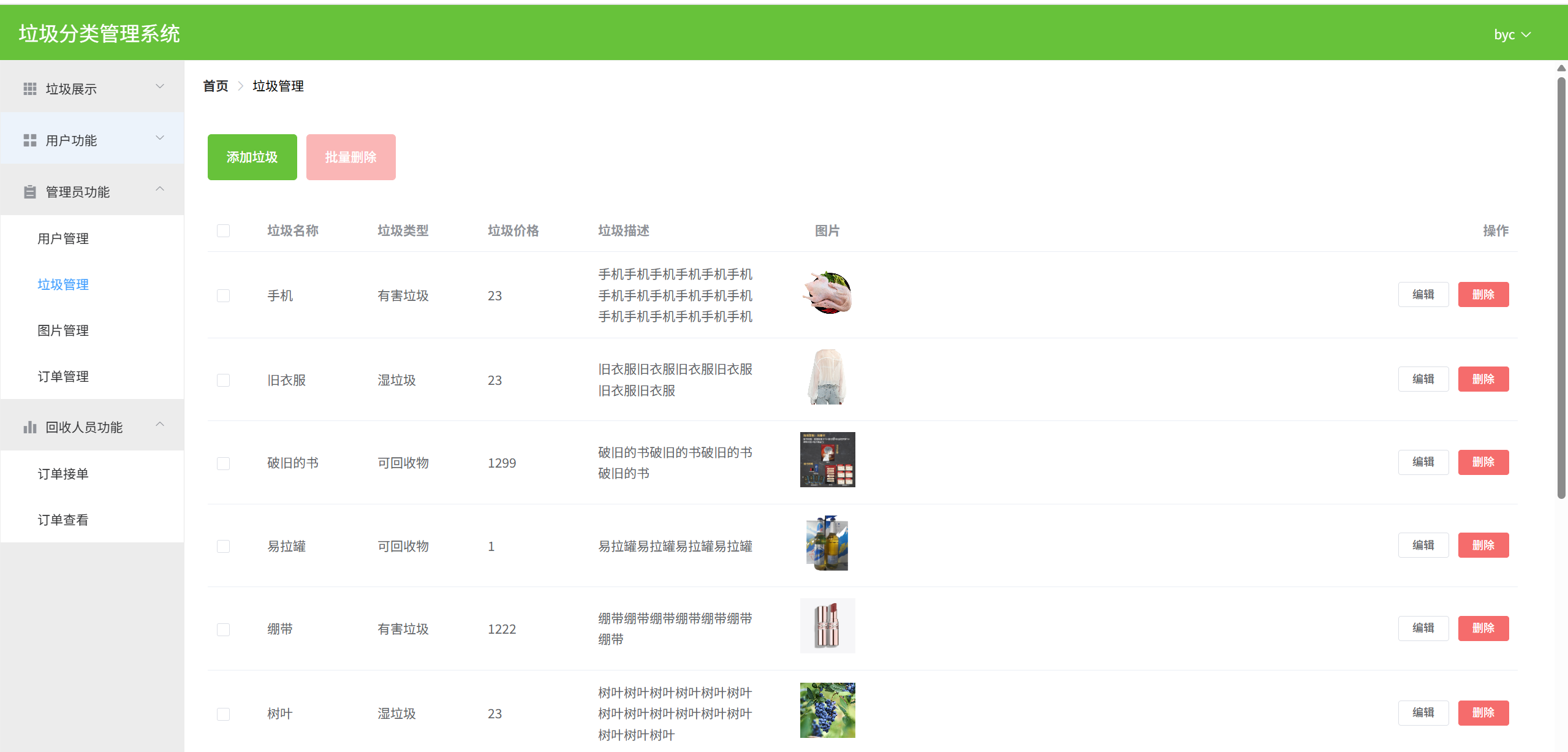管理员可以新增垃圾,新增完垃圾后,需要再图片管理里面给垃圾添加图片。还可以批量删除垃圾,编辑垃圾属性。
