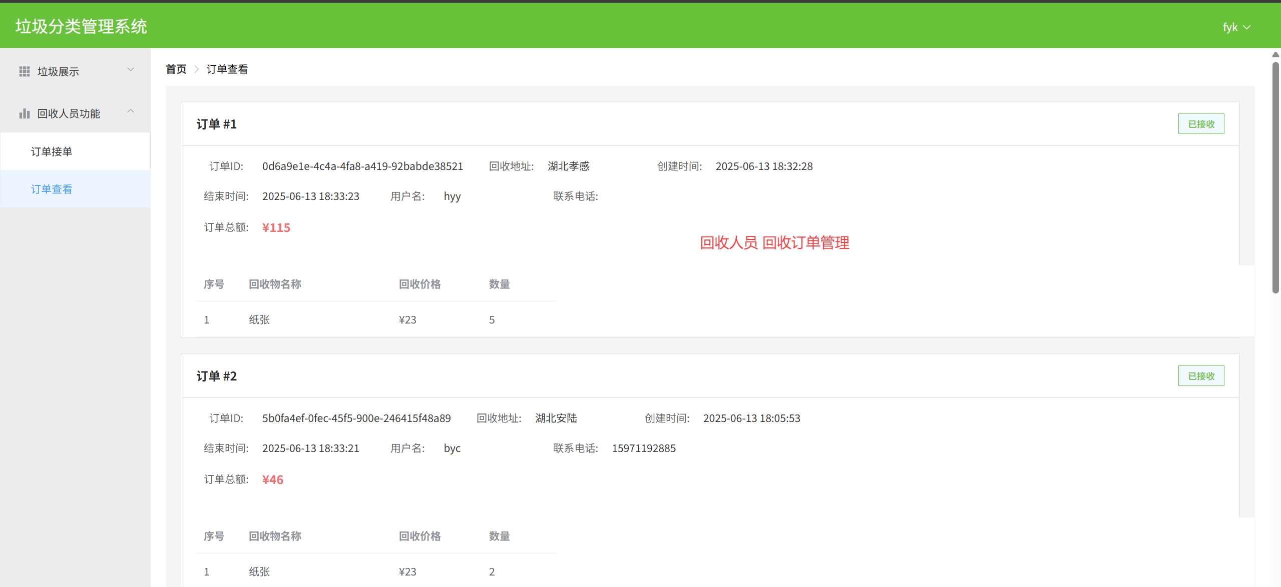 回收人员可以查看平台所有用户发起的垃圾回收单,然后根据请求进行接单,订单上面会显示垃圾信息,还有用户的信息(手机,地址等),回收人员可以根据信息联系到用户,然后上门回收垃圾。