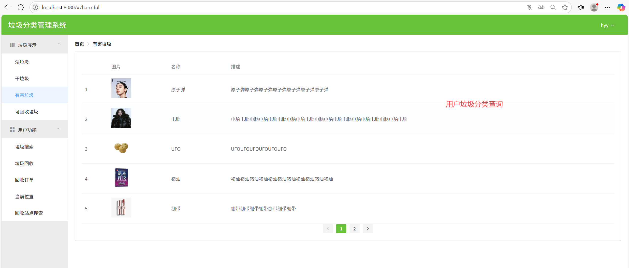 根据垃圾所属的分类查询垃圾列表, 垃圾的分类有:“湿垃圾”,”干垃圾“,”有害垃圾“,”可回收垃圾“。垃圾的属性有”垃圾名称“,”垃圾图片“,”垃圾描述“。