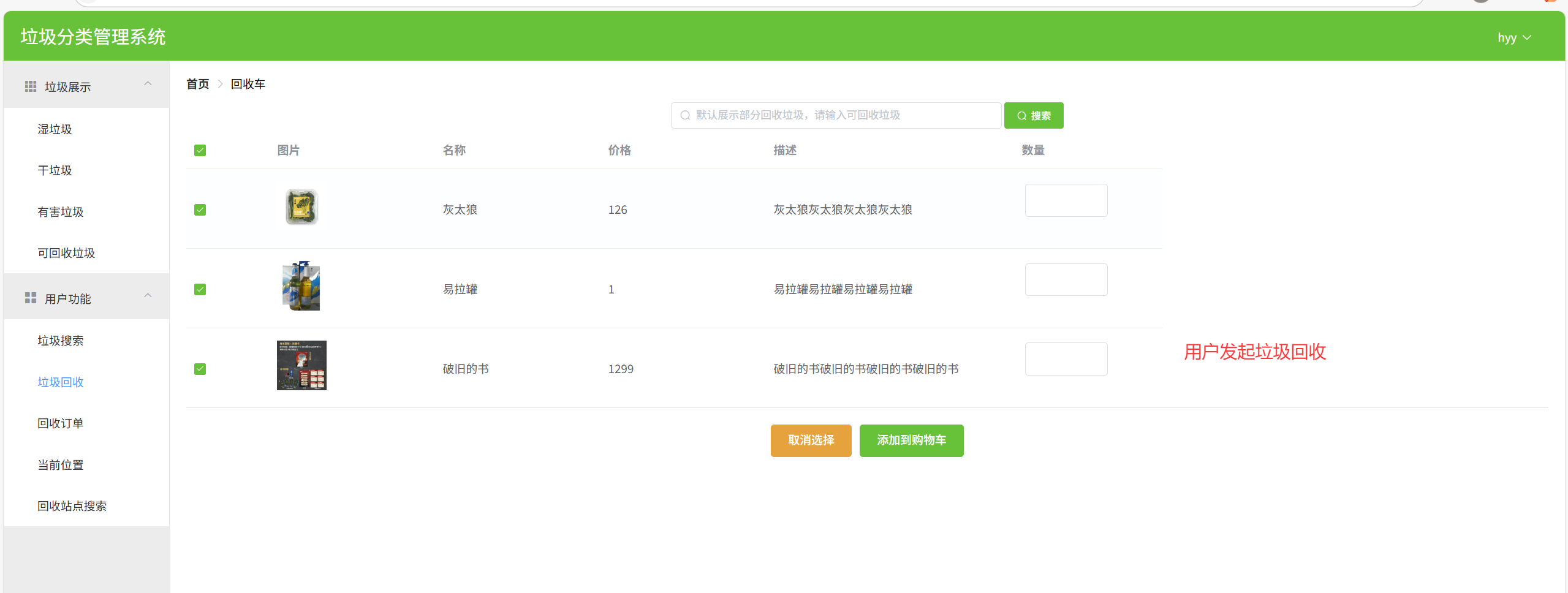 用户可以对可回收分类的垃圾进行发起回收,等待回收人员进行接单处理。回收时,支持批量选中垃圾,必须填垃圾数量,然后添加到购物车,就发起了回收。