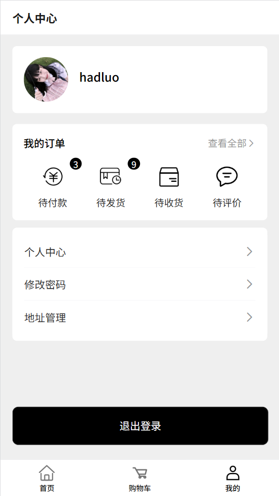 展示用户信息,订单信息,还支持用户自己的收货地址管理,密码管理等。