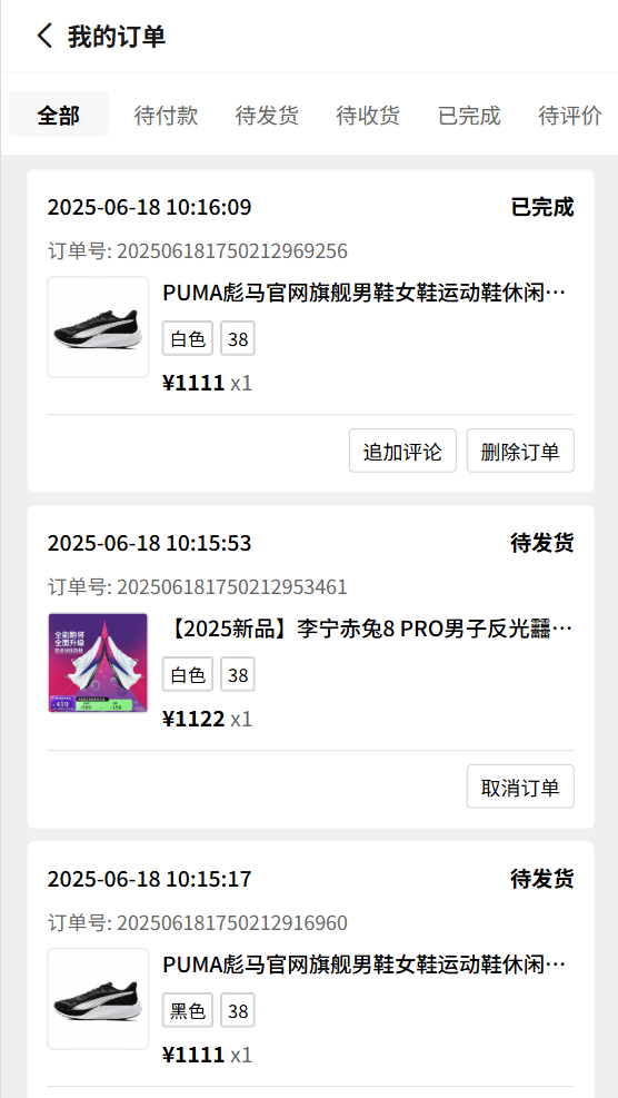 3. 用户拿到鞋子收货后,变成待收货状态,也可以直接申请退款,变成 待退款状态,通过后顶答案变成退订单,前端显示为已完成。