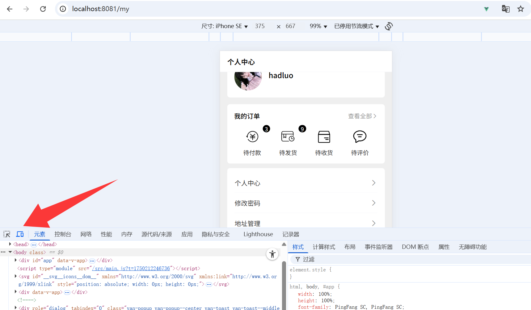 浏览器访问 : http://localhost:8081/ 进入用户端,此时为电脑网页显示,按下F12 ,点击手机模拟,进入手机页面预览: