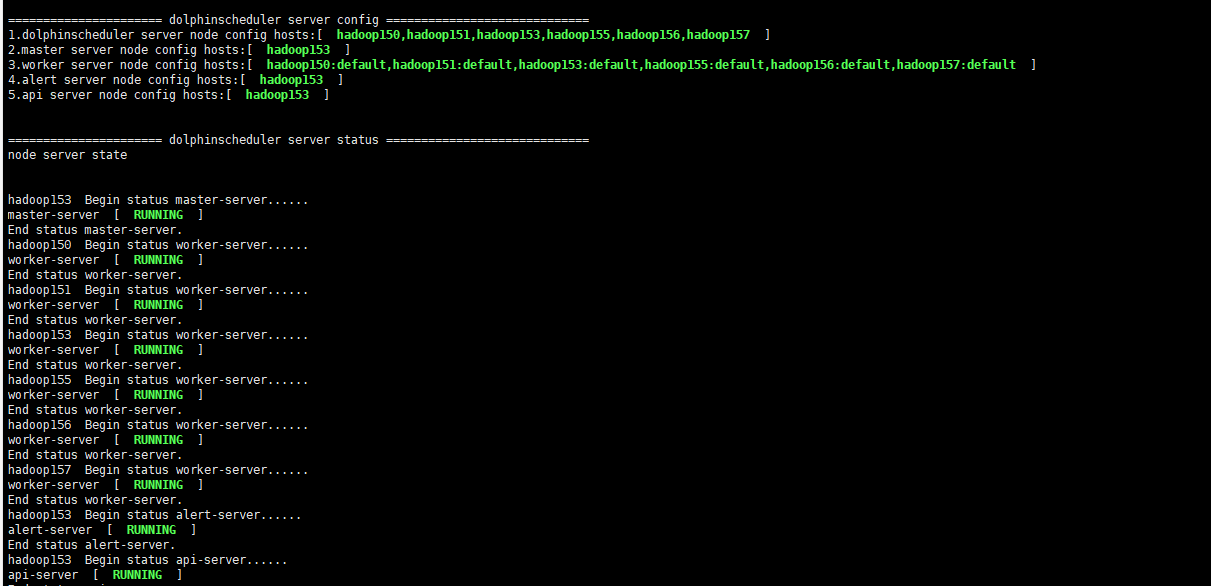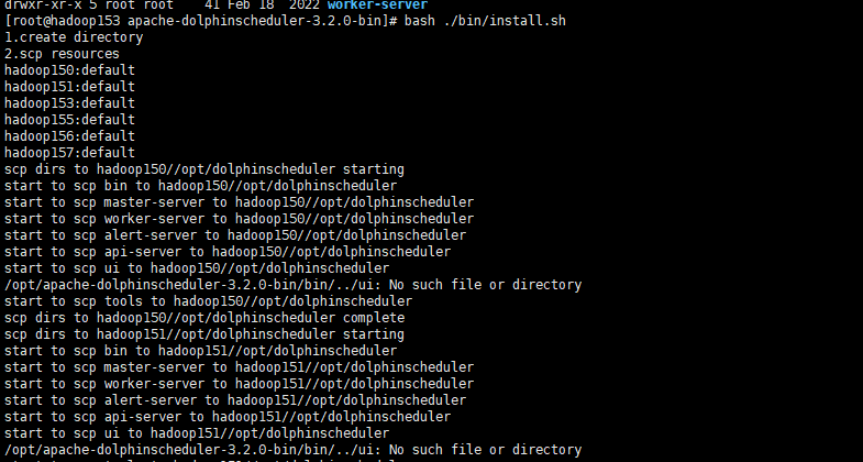 dolphinscheduler集群安装,正确配置完/env/install_env.sh、/env/dolphinscheduler_env.sh脚本后,执行安装脚本报错。排错期间排查了sudo、mkdir、bash命令是否已安装等问题。怀疑是环境问题,尝试将整个解压包拷贝至其他相同版本系统的机器上,发现可正常安装启动。