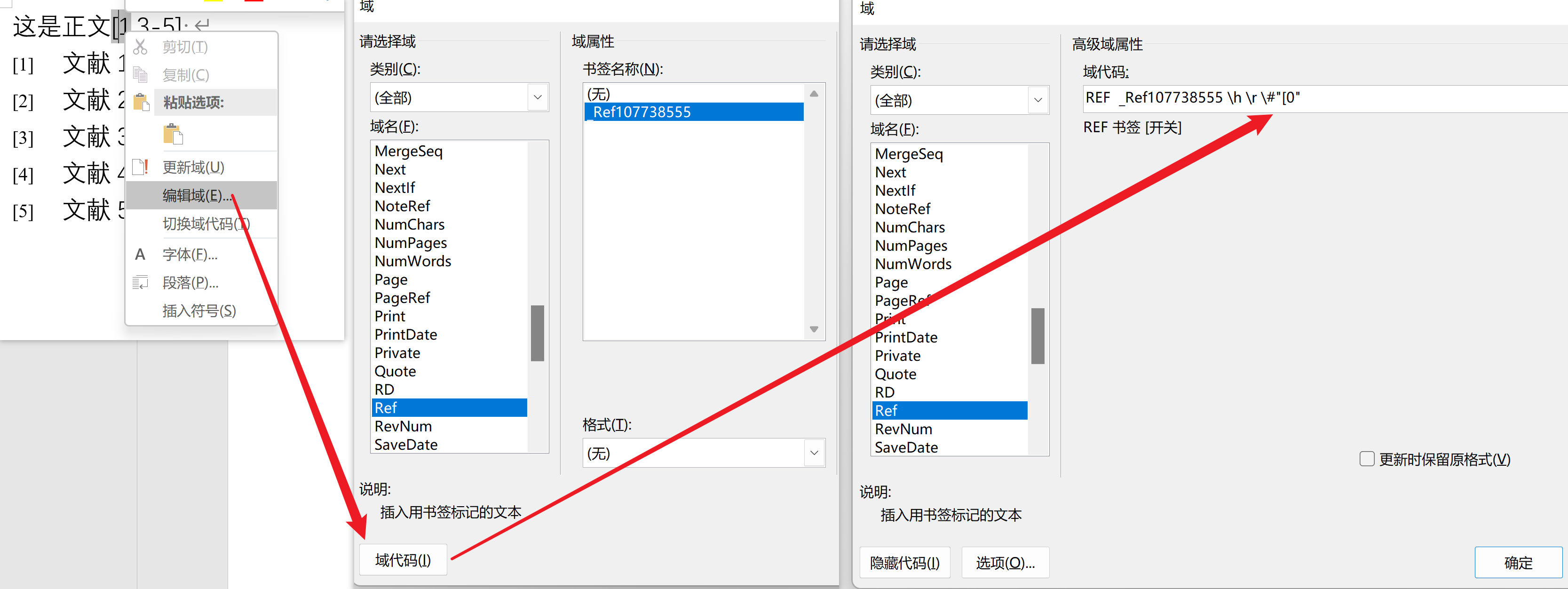添加交叉引用,不连续的引文逐个添加,连续引文添加首尾的文献编号,例如要添加[1,3-5];