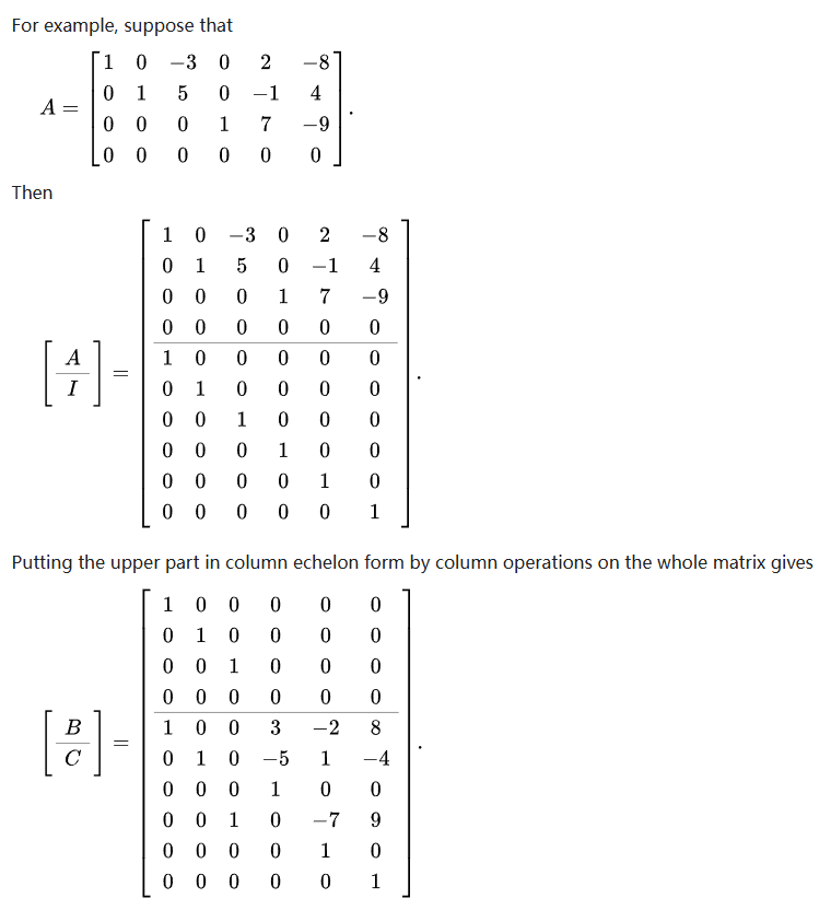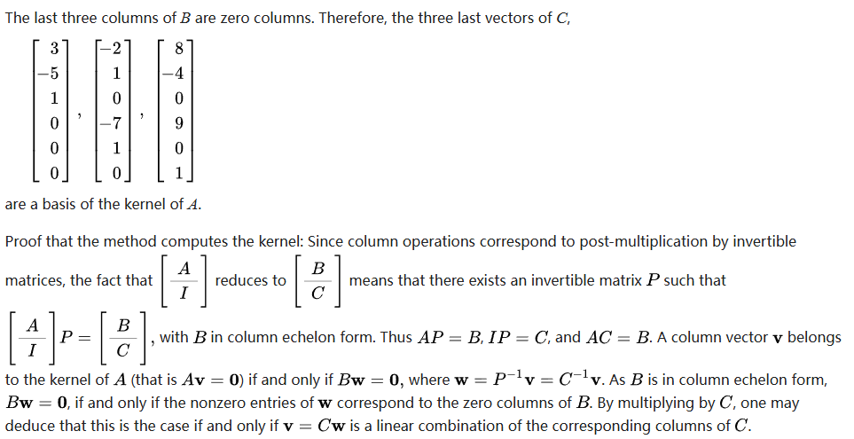 大致描述过程:往基向量下方贴一个单位矩阵,将上面的线性基按列变换消元,下面的 I 的后若干列向量就是核空间的一组基。