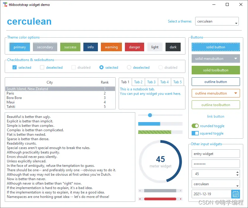 ttkbootstrap 是一个使用 ttk 封装了 前端框架 bootstarp 样式的工具。界面没有前一个项目漂亮,但是对 tkinter 的支持非常完善,并且文档、案例丰富,可惜没有中文文档。