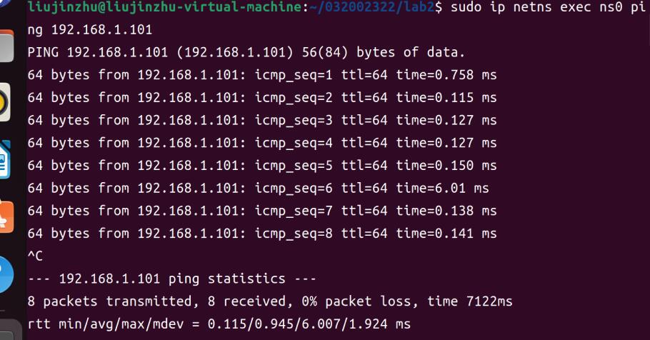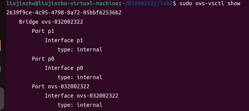 ovs-vsctl基础操作实践:创建OVS交换机,以ovs-xxxxxxxxx命名,其中xxxxxxxxx为本人学号。在创建的交换机上增加端口p0和p1,设置p0的端口号为100,p1的端口号为101,类型均为internal;为了避免网络接口上的地址和本机已有网络地址冲突,需要创建虚拟网络空间(参考命令netns)ns0和ns1,分别将p0和p1移入,并分别配置p0和p1端口的ip地址为190.168.1.100、192.168.1.101,子网掩码为255.255.255.0;最后测试p0和p1的连通性。