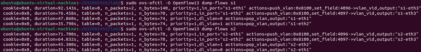 s2.cmd('sudo ovs-ofctl -O OpenFlow13 add-flow s2 priority=1,in_port=2,actions=push_vlan:0x8100,set_field:4097->vlan_vid,output:3')