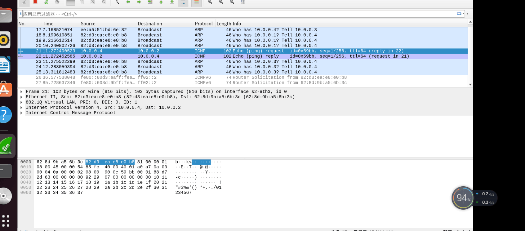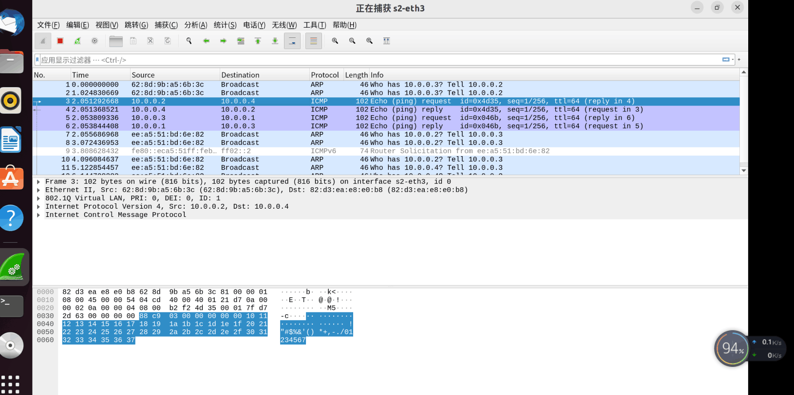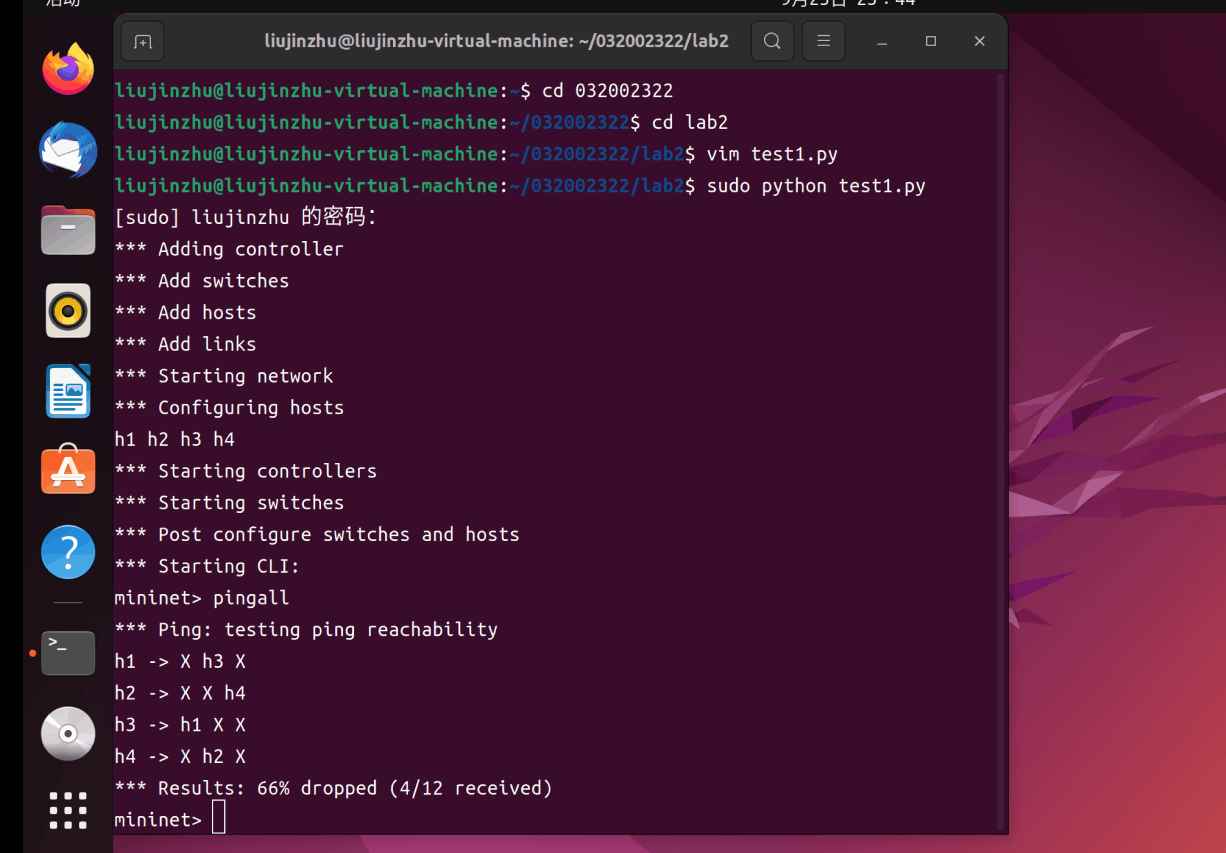 b) /home/用户名/学号/lab2/目录下开启Mininet CLI并执行pingall命令的截图、上述目录下查看OVS流表的命令结果截图,wireshark抓包截图,其余文字请勿赘述,否则扣分